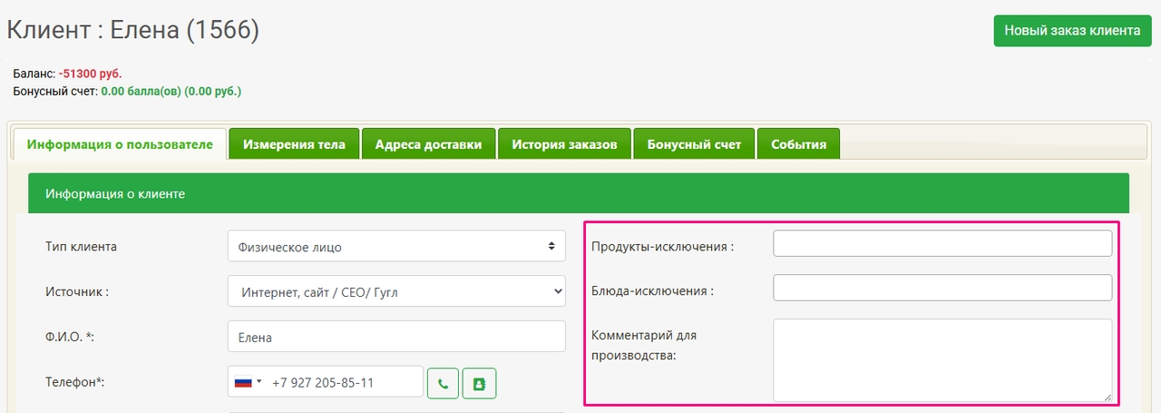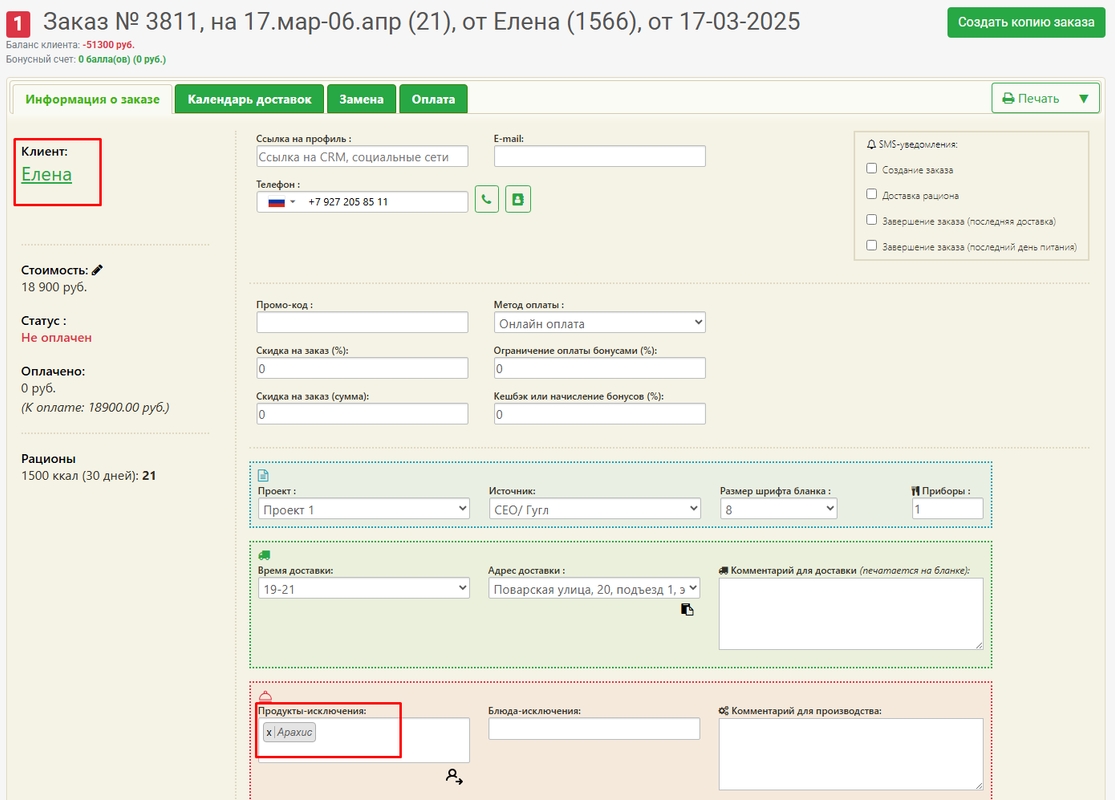 Эти настройки привязаны к заказу, связаны с аналогичными настройками клиента - рассмотрим подробнее ниже. А небольшим отступлением поясним, что эта гибкость даёт возможность разнести исключения одного клиента по разным заказам - позволит проследить историю предпочтений клиента, а также функцию можно использовать в случаях, когда клиент заказывает на себя и на другого члена семьи и у них разные предпочтения👪.