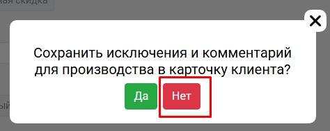 При создании заказа нового клиента или если у постоянного клиента поменялись исключения/комментарий производства, то введите нужные изменения, а на последнем шаге после нажатия кнопки Создать во всплывашке нажмите кнопку ДА - прокинуть изменения в карточку клиента: