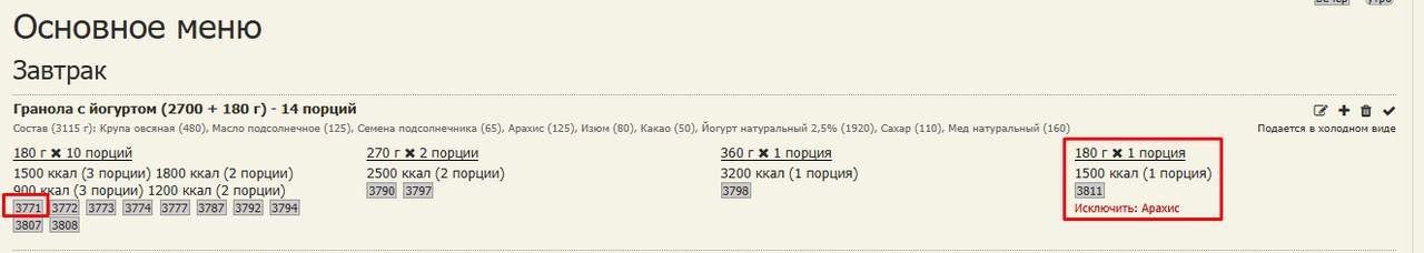 В красном блоке объединена первостепенная информация для производства: исключения по продуктам, блюдам и комментарий: