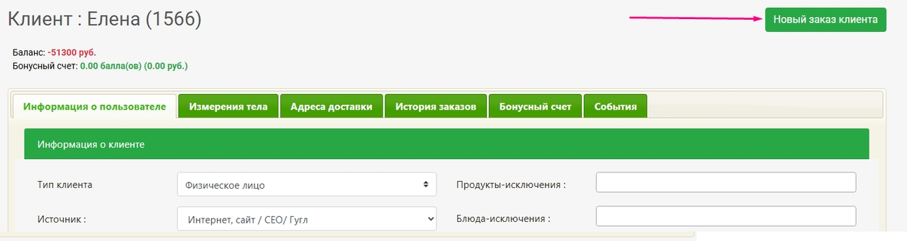 Т.е. по кнопкам создания нового заказа со страницы Клиенты и из карточки клиента (см.скрины ниже) - будет создан заказ с исключениями и комментарием производства из клиента. Остальная информация (диета, тариф, адрес и т.д.) берется из настроек последнего заказа клиента.