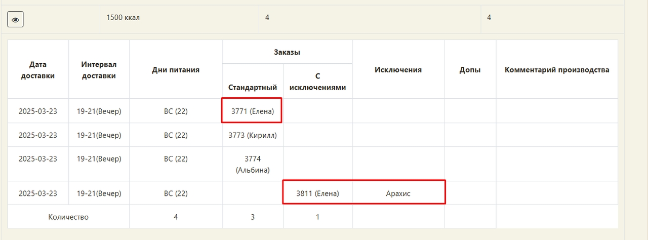 А у её дочери стоп-продукт Арахис. Для разделения исключений добавим новый заказ Елены, укажем исключение Арахис: