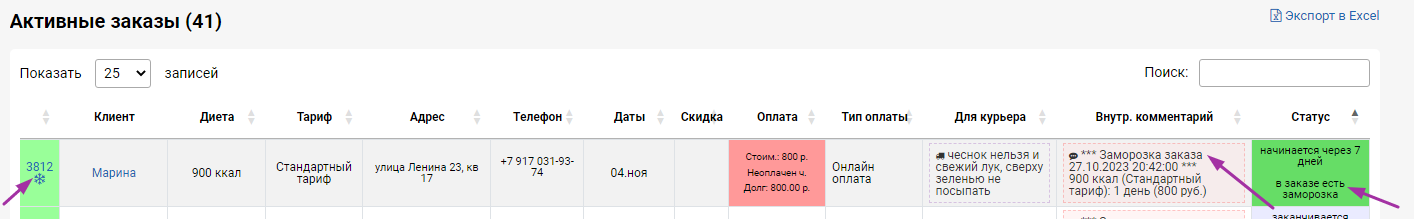 На странице Заказы у №замороженного заказа также появится значок снежинки, а в последнем столбце Статус появится надпись "в заказе есть заморозка".
