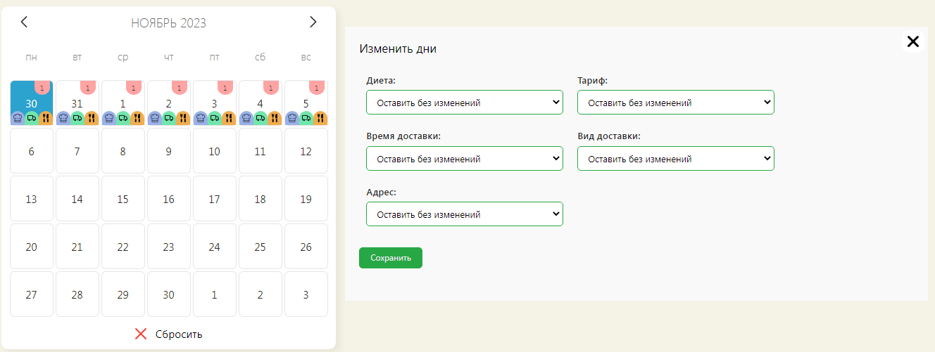 Выделенный **созданный** день на календаре ![](https://2821177410-files.gitbook.io/~/files/v0/b/gitbook-x-prod.appspot.com/o/spaces%2FJ0V5Rw2ZghShlKrek3xB%2Fuploads%2Fgit-blob-ef9e68acf539ae66d51db8d9f292f57ecf749701%2Fimage.png?alt=media)- день **доставки** рациона.