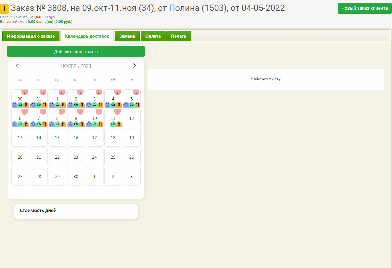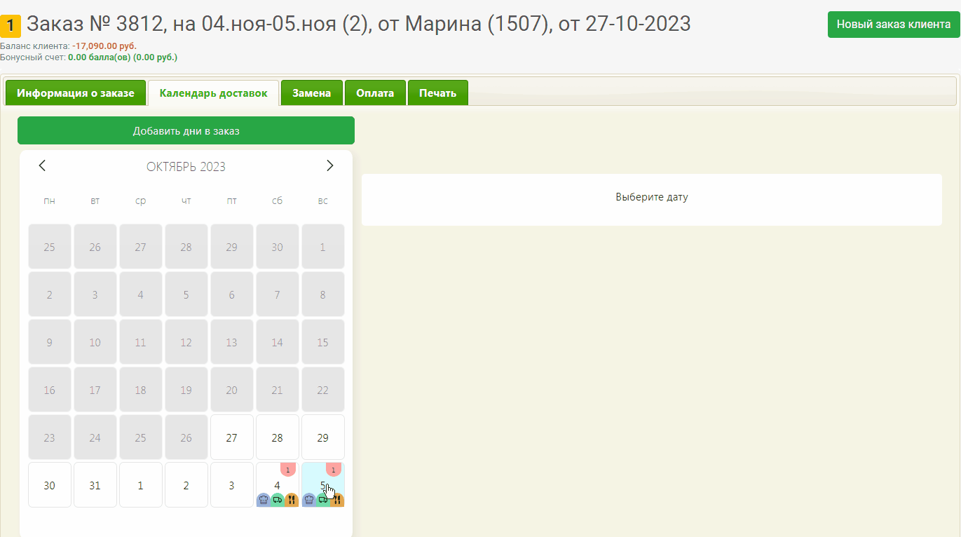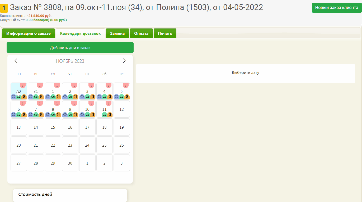 Для удаления дней выделите эти дни доставки на календаре, нажмите кнопку **Удалить**. Выбранный день доставки удалится из заказа.
